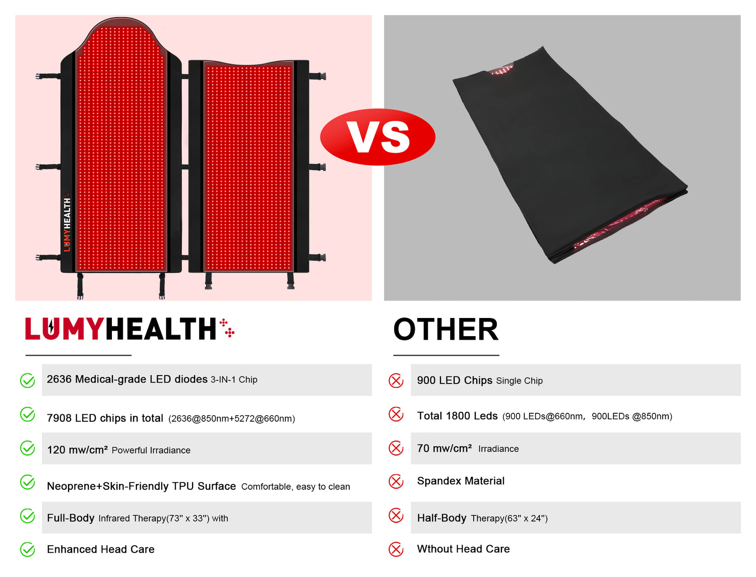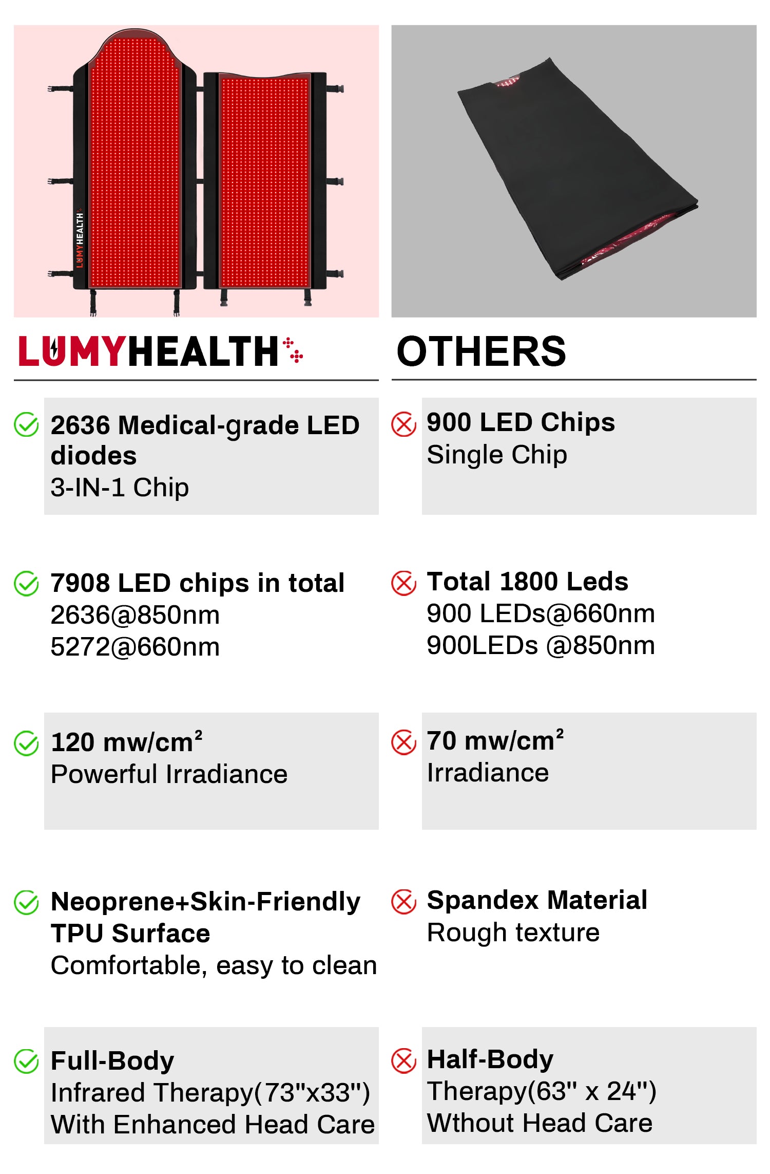 Each LED combines 2*630nm red light for skin benefits like collagen production and 1*850nm near-infrared light for deep tissue healing, offering comprehensive health and wellness advantages.