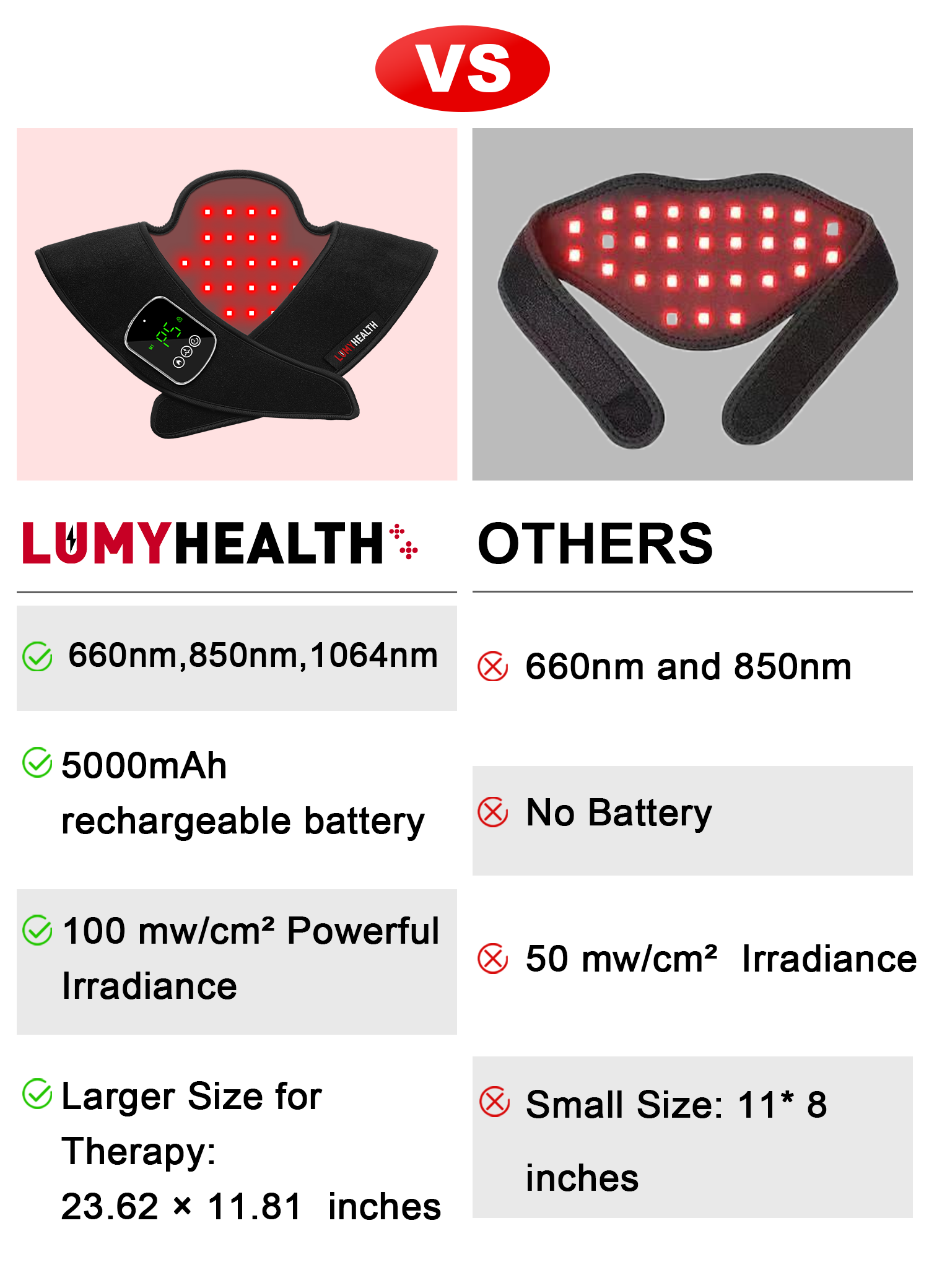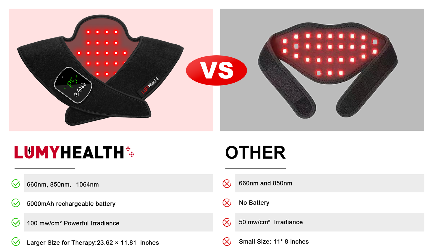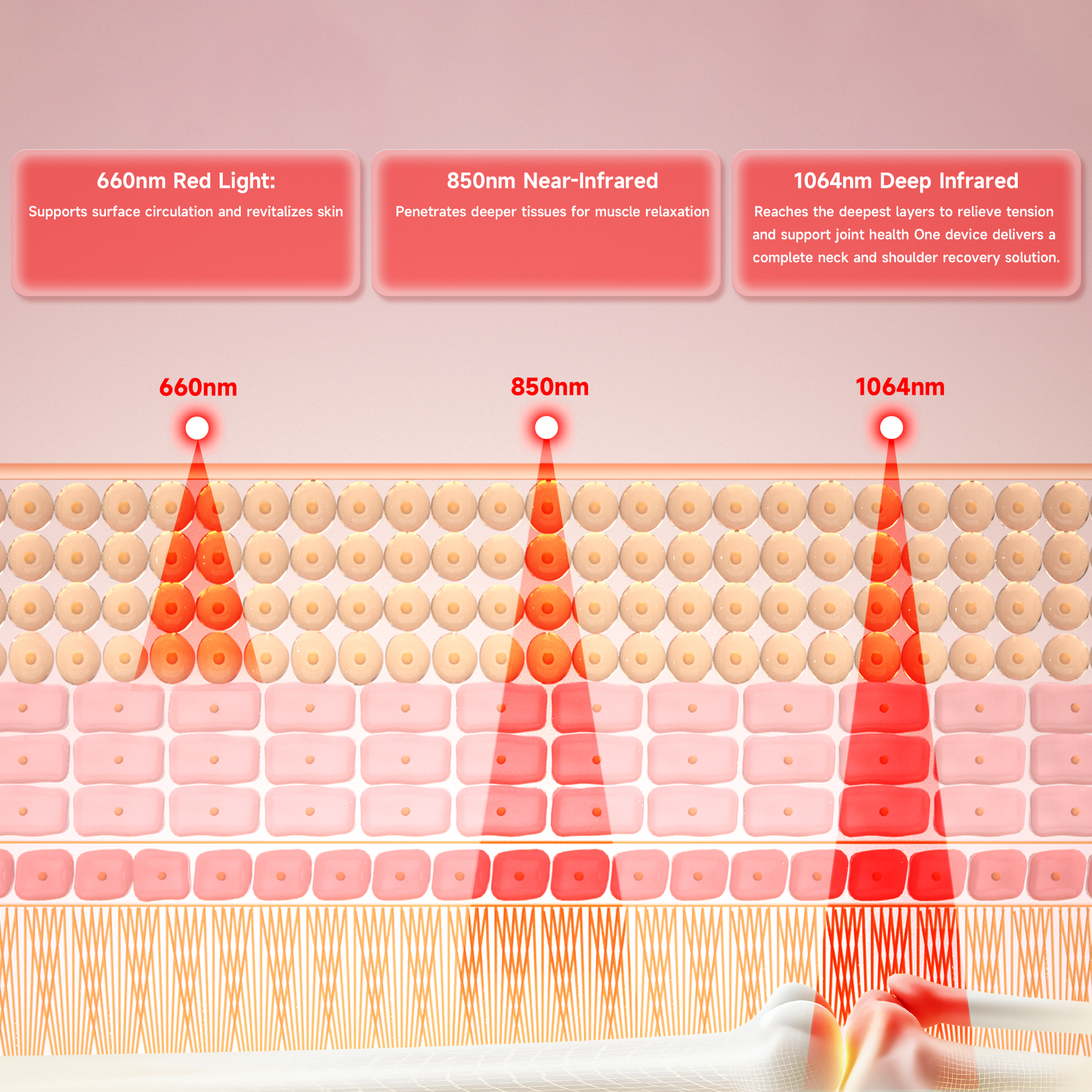 Targeted Neck & Shoulder Relief Dual 660nm red, 850nm near-infrared and 1064nm infrared wavelengths penetrate different tissue depths, helping you address everyday stiffness, soreness, and tension right where you need it most.
