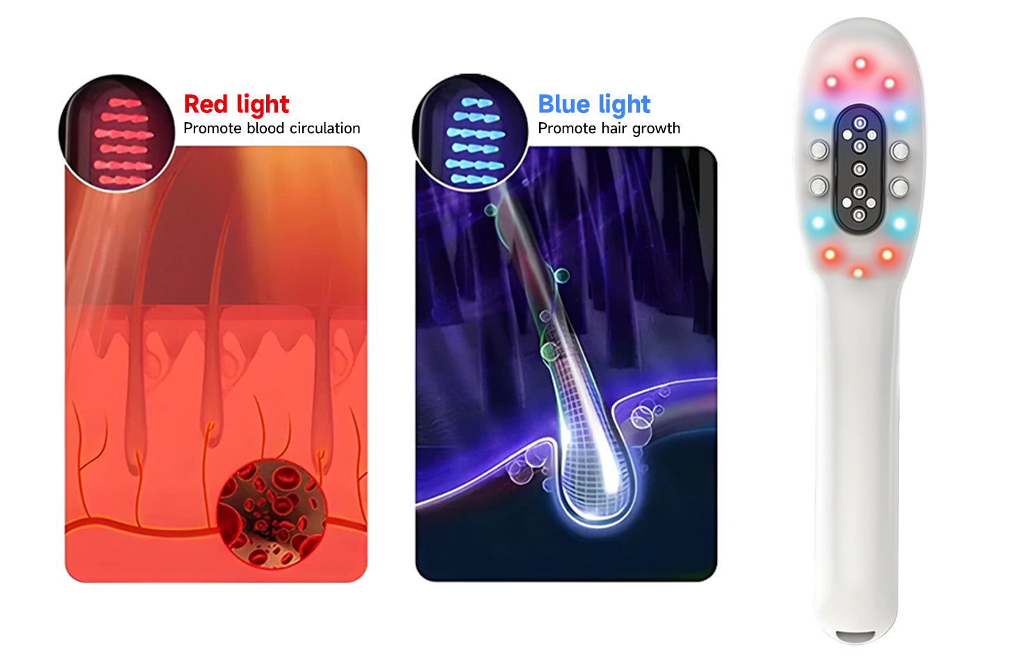 The comb uses 655 nm red light to penetrate deep into the hair roots, stimulating hair follicles and promoting blood circulation to encourage natural hair growth.