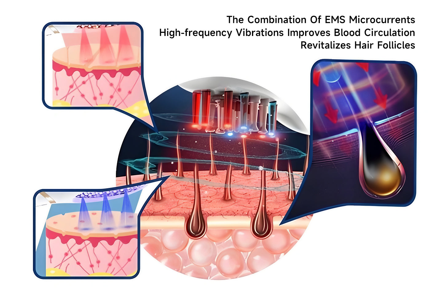 EMS microcurrent and high-frequency vibrations improve blood circulation, revitalize hair follicles, and stimulate hair growth at the root level, helping you achieve thicker, healthier hair.