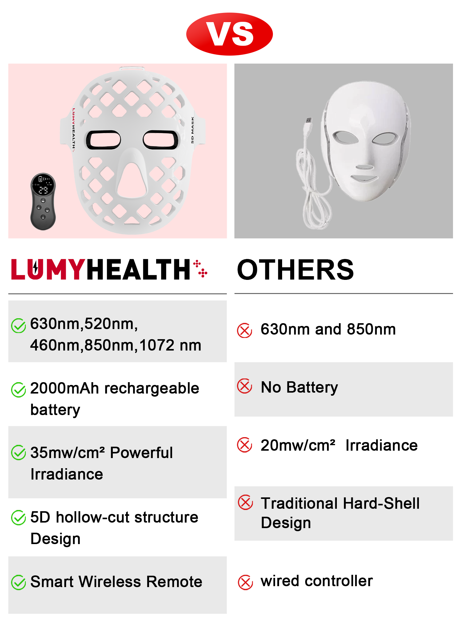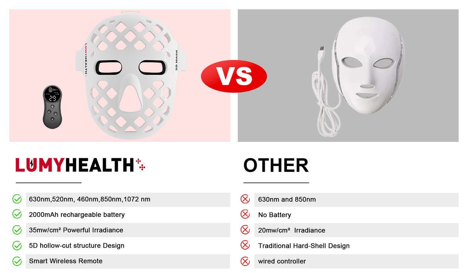 Unlike traditional LED masks that require wired controllers and bulky adapters, LumyHealth’s 5D Mask is fully wireless and portable. Enjoy professional-grade therapy anytime, anywhere — no cords, no hassle, just pure rejuvenation on the go.