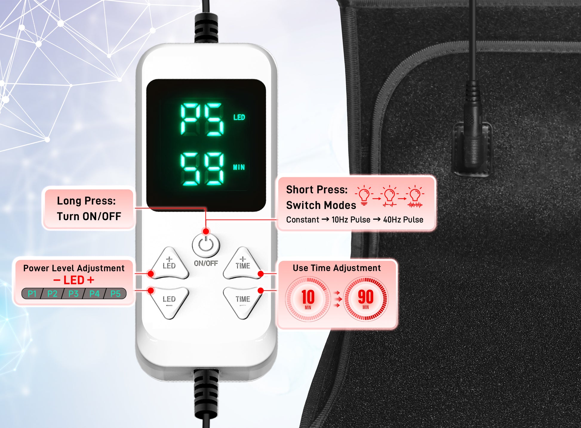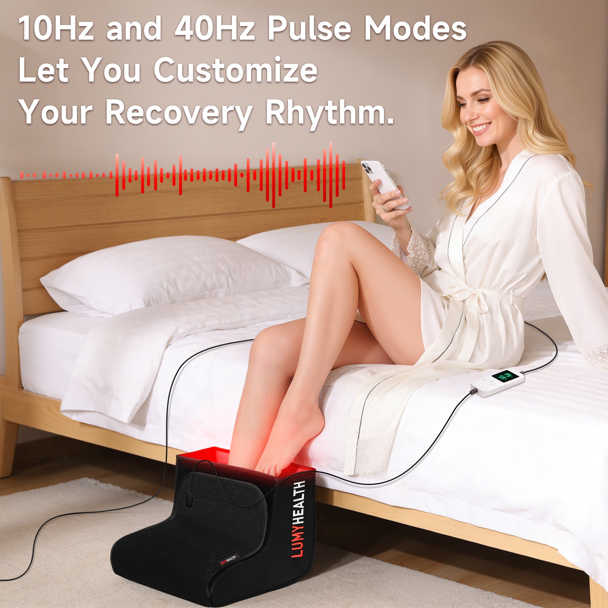 Features 3 selectable light pulse modes—steady, 10Hz, and 40Hz—allowing you to customize your session. These options let you choose the setting that best suits your personal comfort and routine.