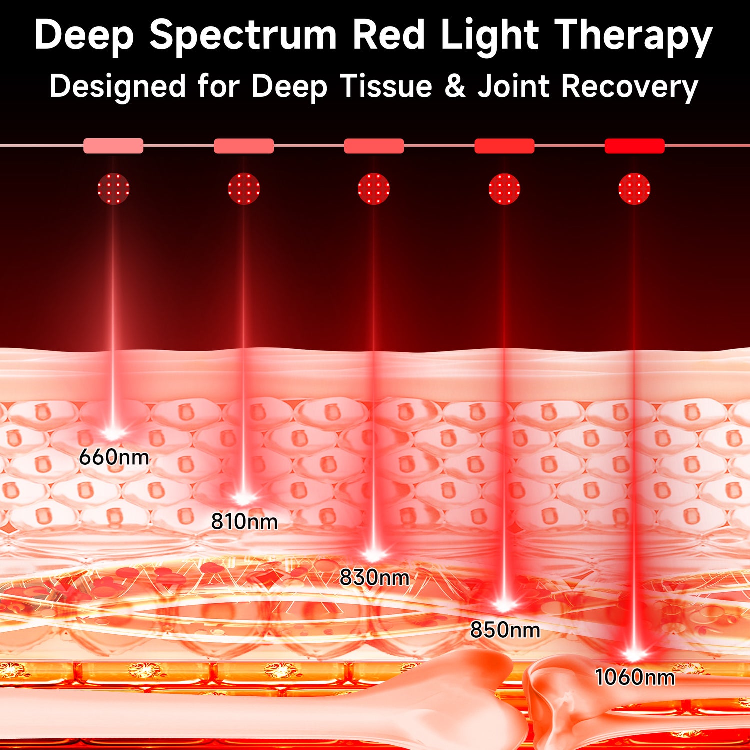 This boot combines 660 nm, 810 nm, 830 nm, 850 nm, and 1060 nm wavelengths to target multiple tissue depths. Red light supports surface tissues, while near-infrared wavelengths penetrate deeper to reach muscles, joints, and connective tissue for comprehensive foot therapy.