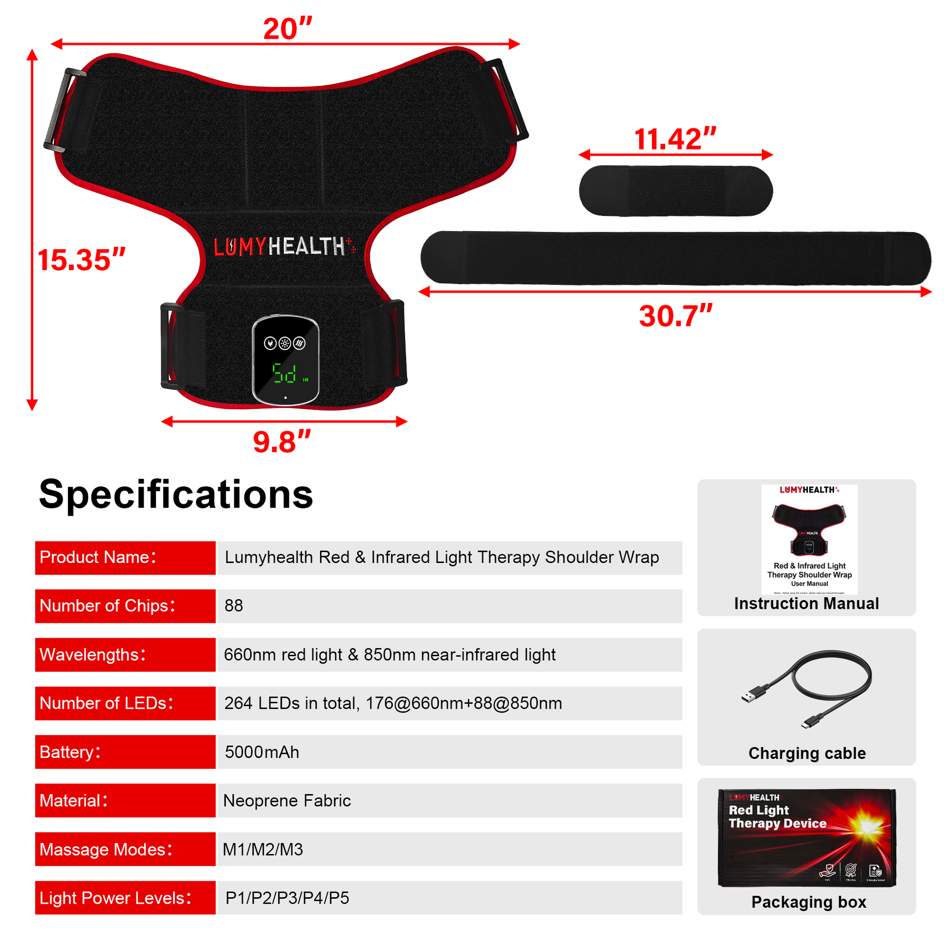 Dual-Wavelength LED Therapy (660nm + 850nm)-Equipped with 88 medical-grade LEDs, this wrap delivers targeted red and near-infrared light directly to shoulder area.