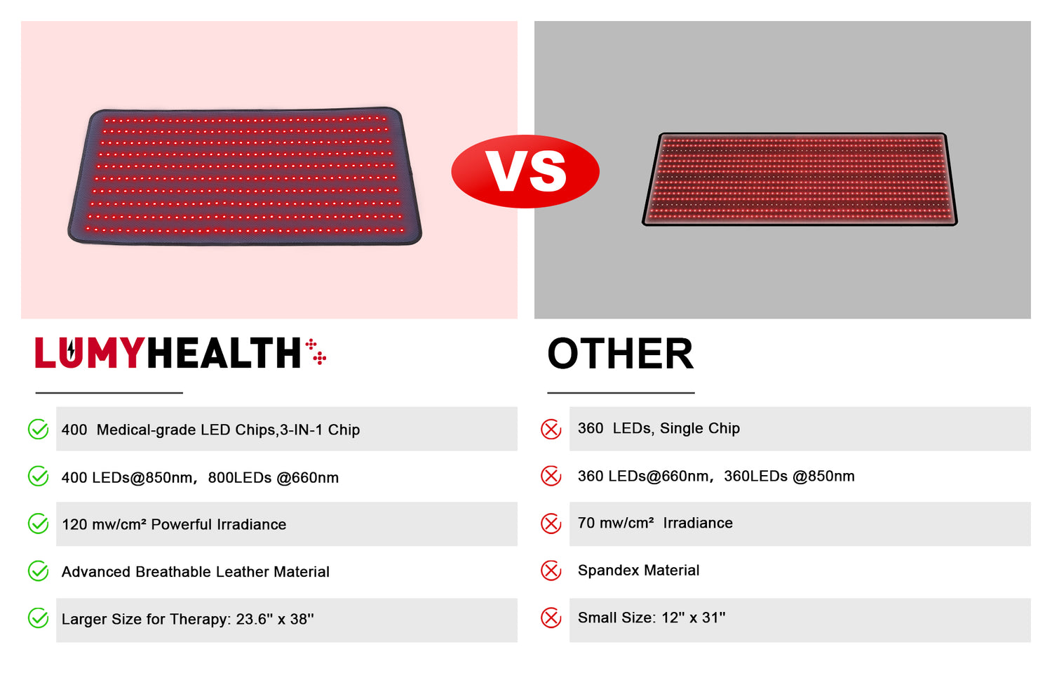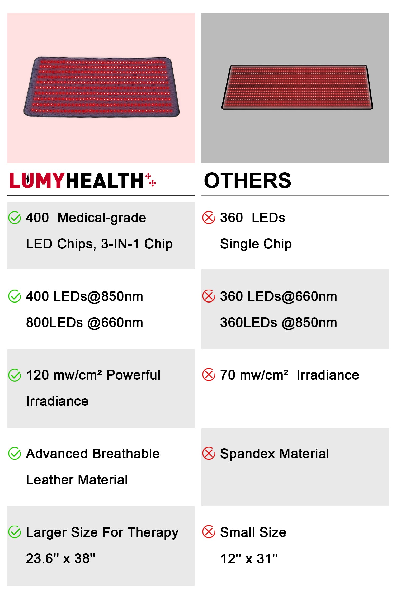 Our red light therapy mat is equipped with 400 Medical-grade LED diodes with 3 chips per diode= 1200 LED chips per mat(400@850nm+800@660nm )